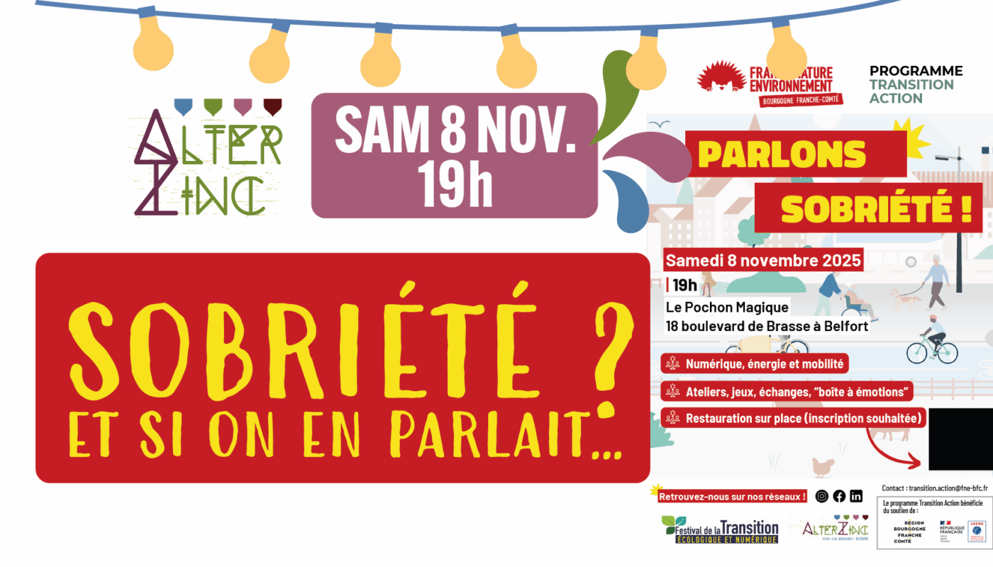 Rendez-vous le samedi 8 novembre à 19h à Alterzinc ! Dans le cadre du Festival de la Transition écologique et numérique, Alterzinc a le plaisir d’accueillir France Nature Environnement Bourgogne-Franche-Comté pour une soirée conviviale sur la sobriété numérique, énergétique et en mobilité.