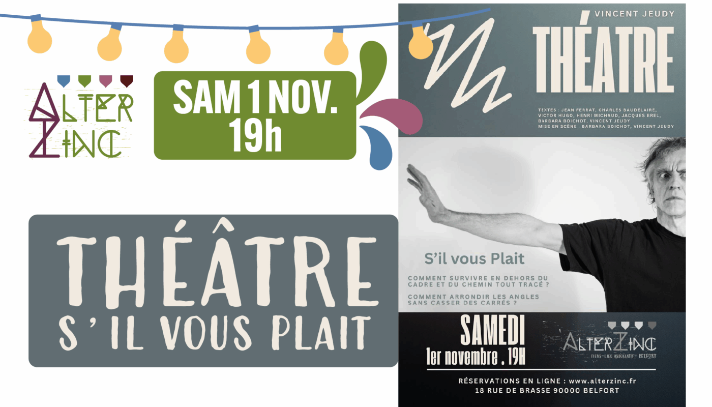 Samedi 1er novembre à 19h à Alterzinc, 18 rue de Brasse, Belfort : “S’il vous plaît” de Vincent Jeudy débarque à Alterzinc !