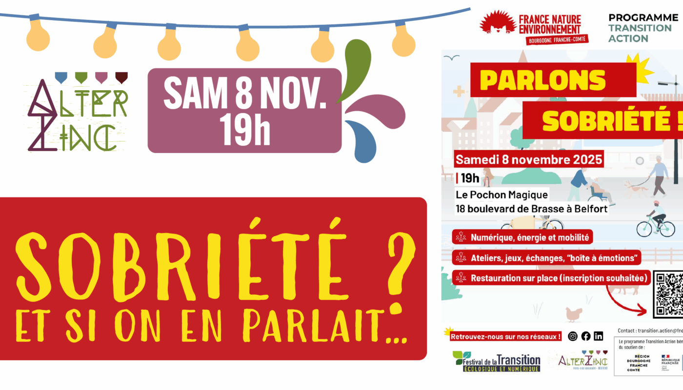 Rendez-vous le samedi 8 novembre à 19h à Alterzinc ! Dans le cadre du Festival de la Transition écologique et numérique, Alterzinc a le plaisir d’accueillir France Nature Environnement Bourgogne-Franche-Comté pour une soirée conviviale sur la sobriété numérique, énergétique et en mobilité.